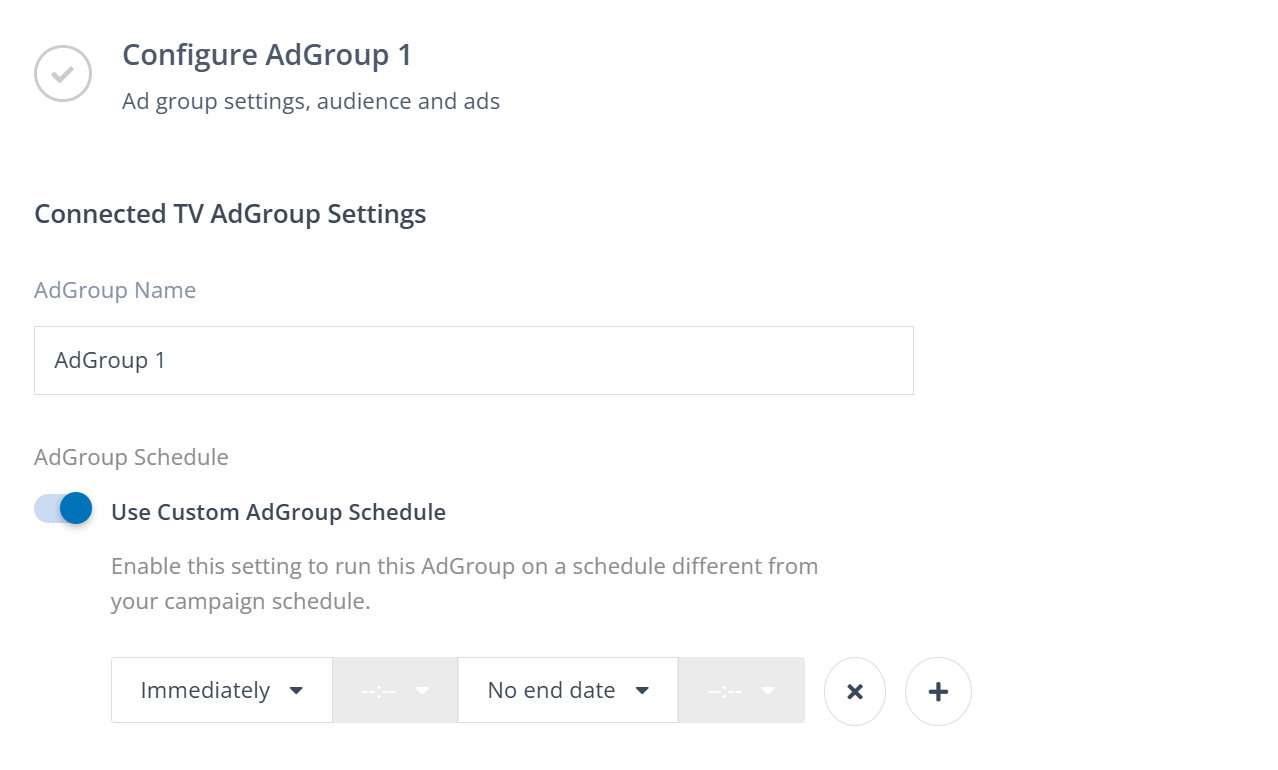 If you want this AdGroup to run on a different schedule than your main campaign schedule, toggle on Use Custom AdGroup Schedule and select your start and end dates.
