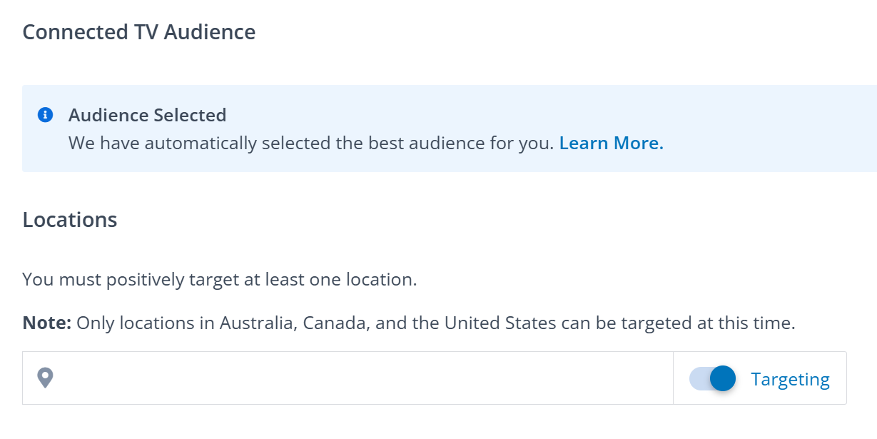 CTV campaigns are available for US, Canada, and Australia audiences