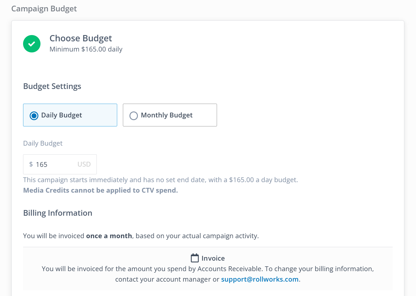 - The minimum daily budget for each CTV campaign is USD $165. We strongly recommend running CTV campaigns for at least one month for optimal results.