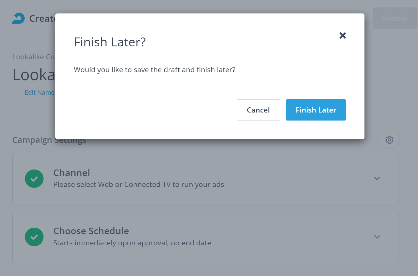 Once you're done setting your campaign, scroll up to the top of the page and click Submit. You can also click Finish Later to save your campaign as a draft.