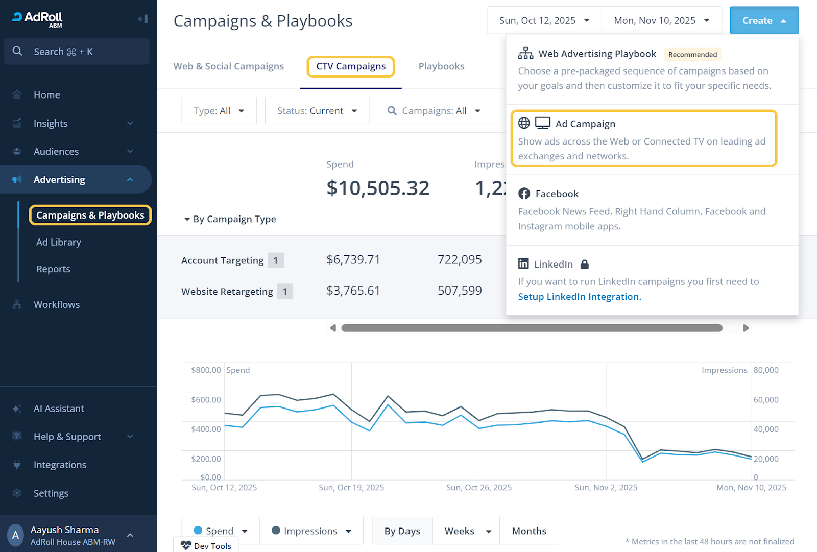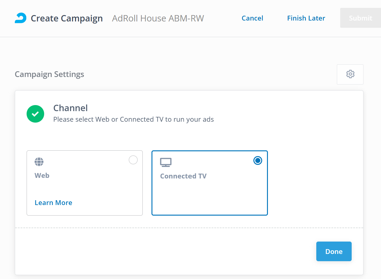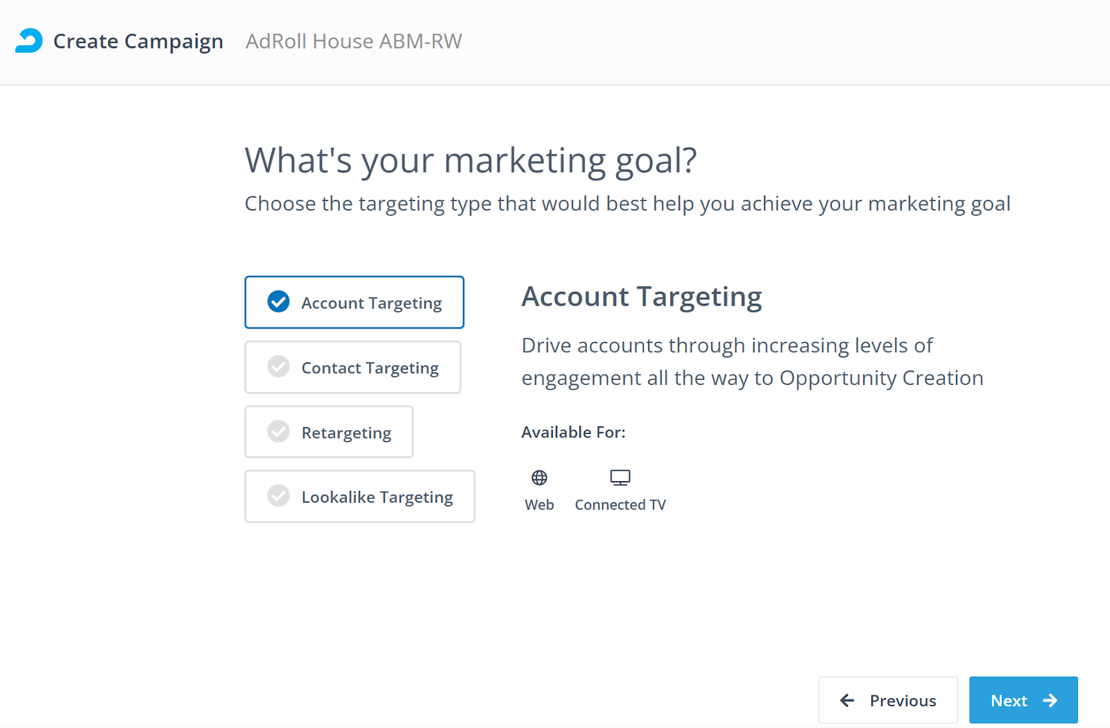 Access to Account Targeting Campaigns for CTV Channel depends on your AdRoll ABM package.