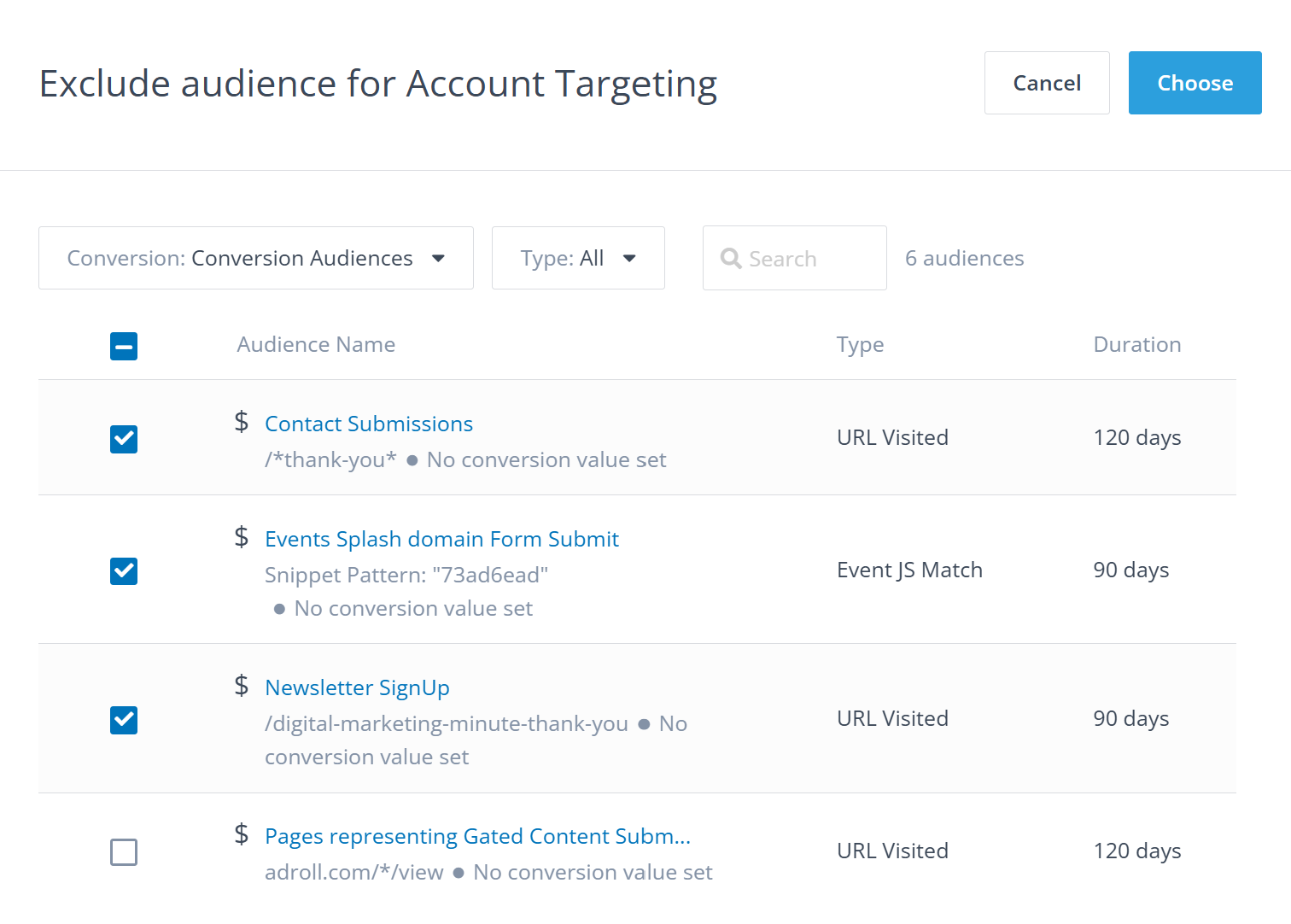 - Filter by Conversion Audiences only and select them all, then click Choose. Conversion audience names include a dollar sign $ prefix for easy identification.