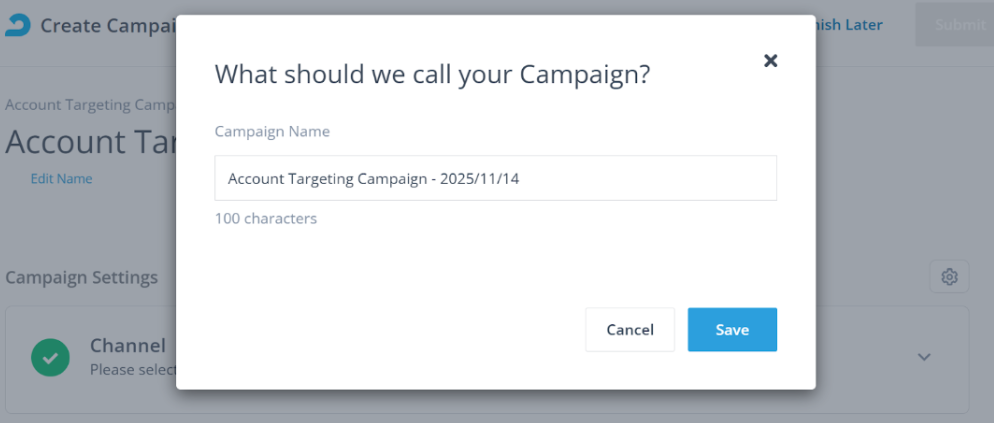 Click Edit Name at the top of your campaign and choose a name that will be easy to identify across reports and AdRoll ABM platform features. We recommend following a consistent naming convention for all your campaigns.