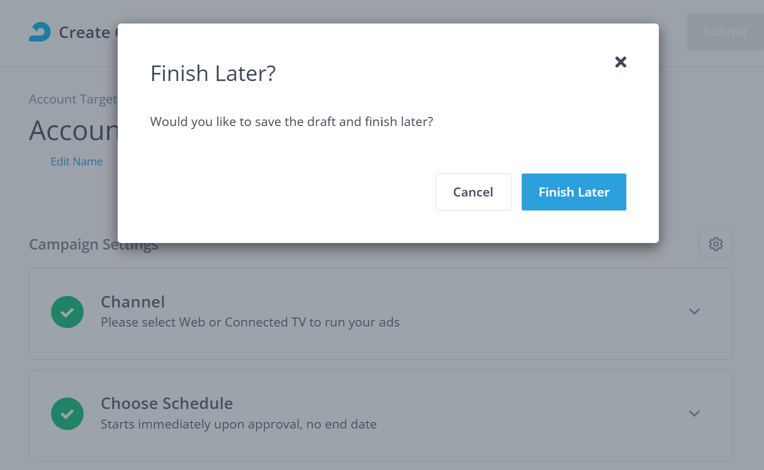Once you're done setting your campaign, scroll up to the top of the page and click Submit. You can also click Finish Later to save your campaign as a draft.