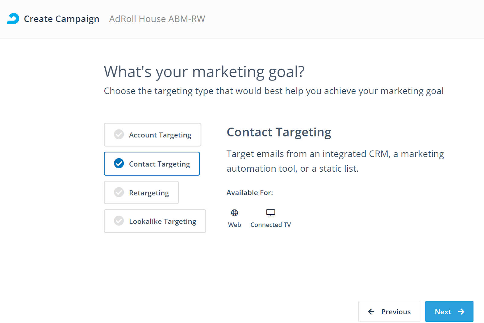 Access to Contact Targeting Campaigns depends on your AdRoll ABM package: