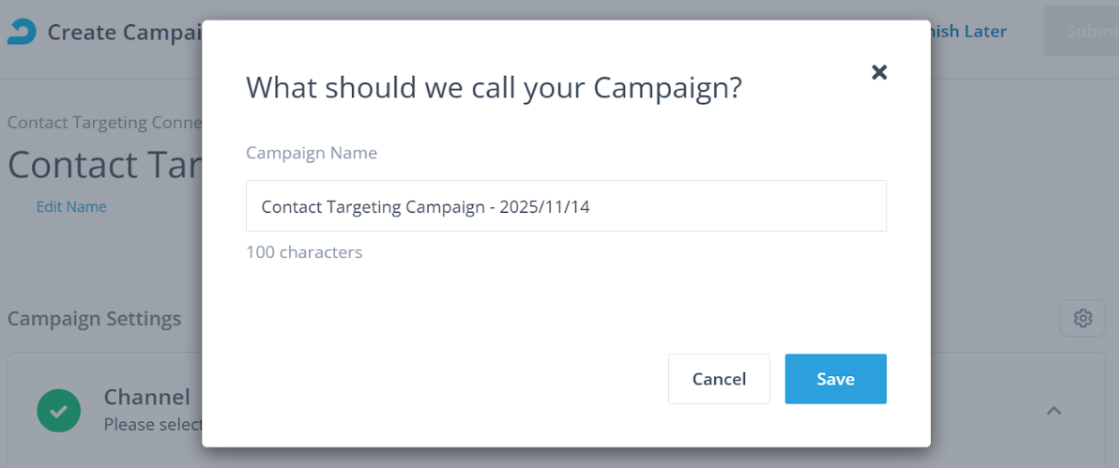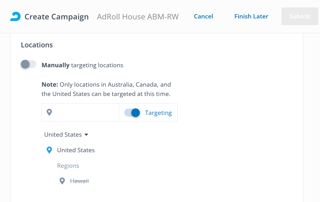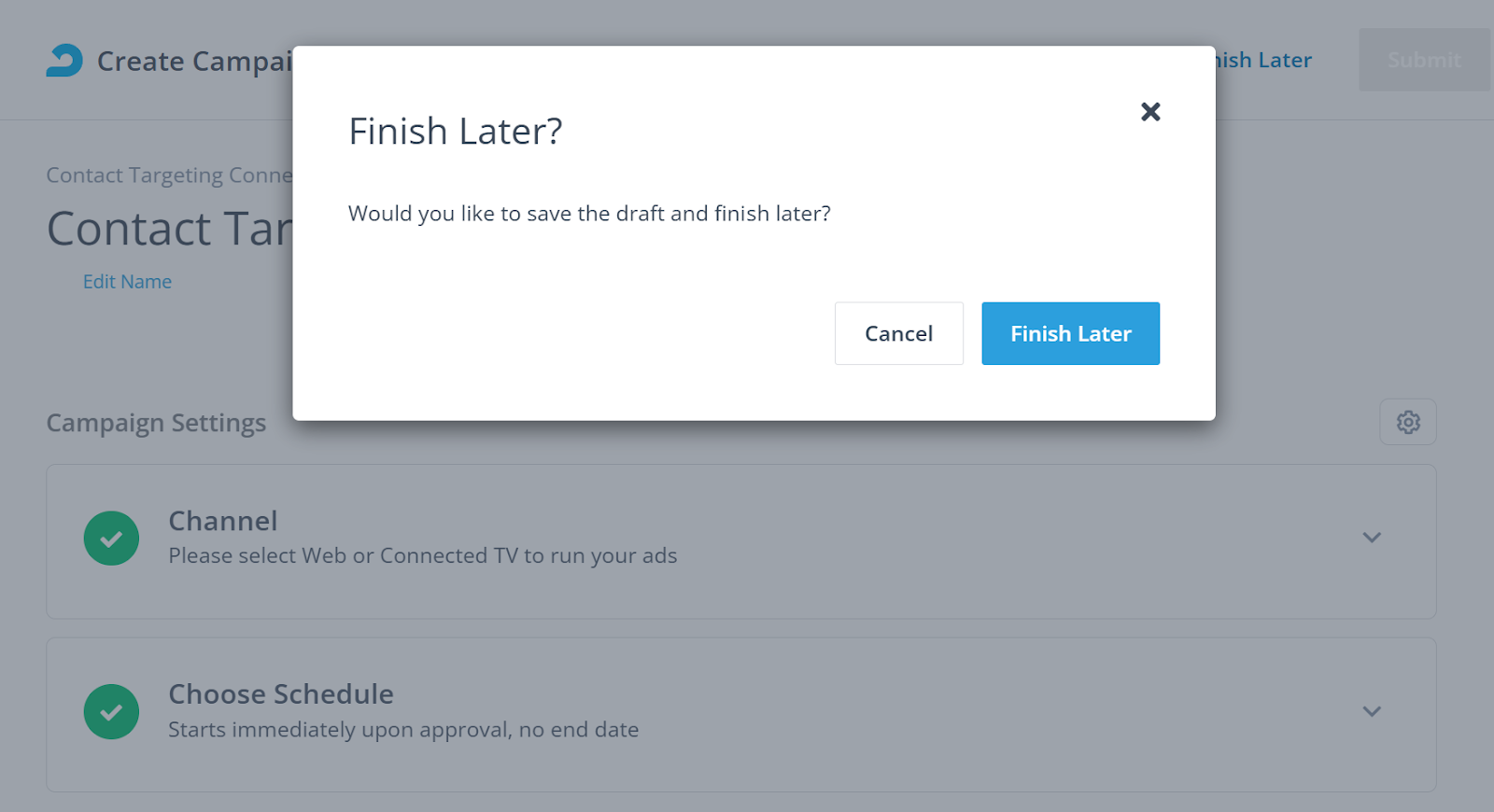 Once you're done setting your campaign, scroll up to the top of the page and click Submit. You can also click Finish Later to save your campaign as a draft.