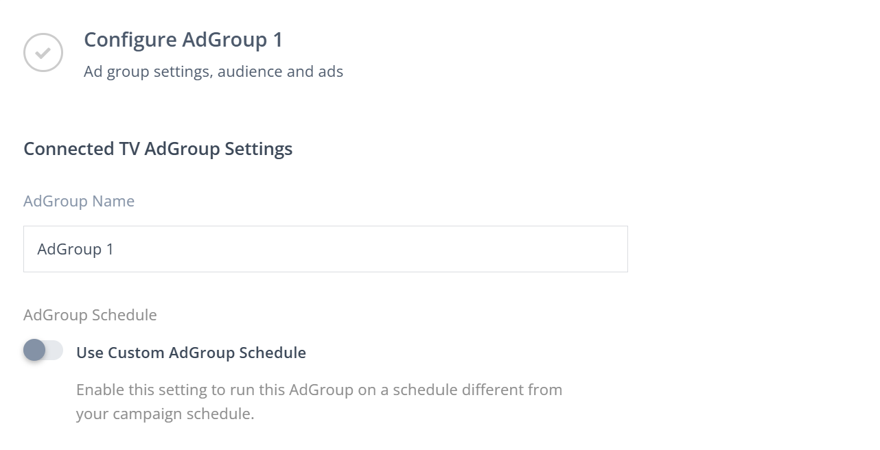 If you want this AdGroup to run on a different schedule than your main campaign schedule, toggle on Use Custom AdGroup Schedule and select your start and end dates.