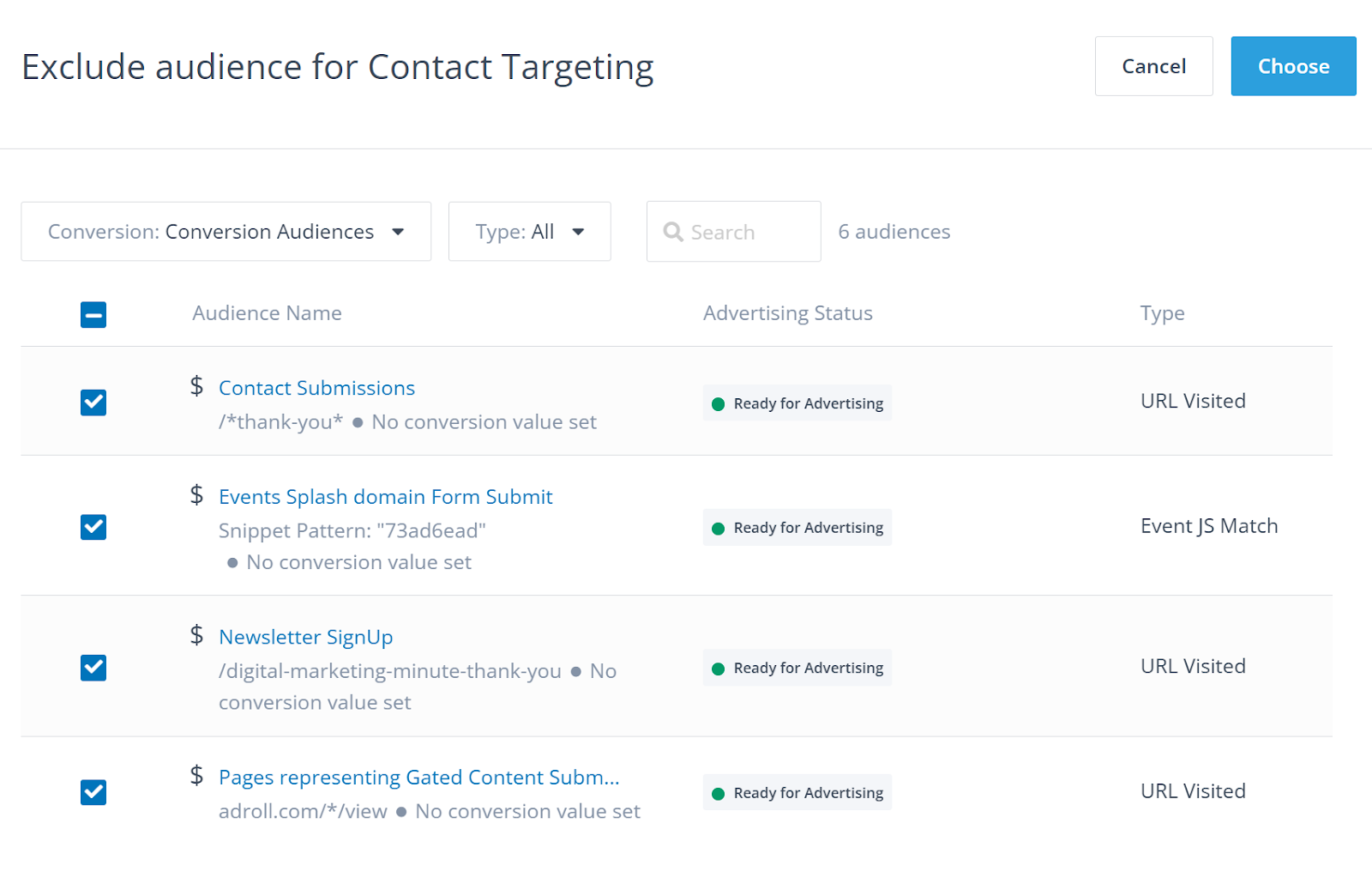 - Filter by Conversion Audiences only and select them all, then click Choose. Conversion audience names include a dollar sign $ prefix for easy identification.