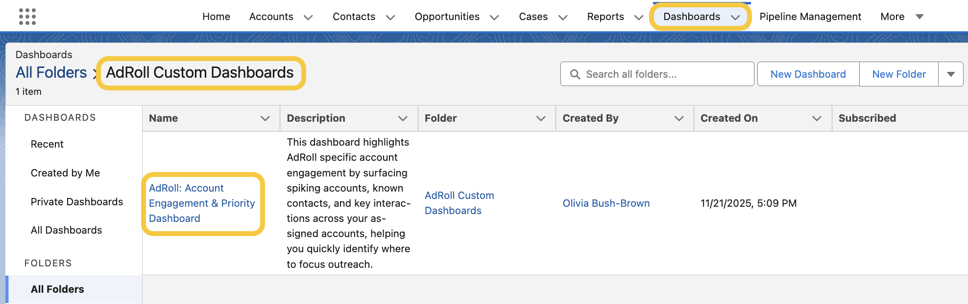 To reach the new AdRoll Custom Dashboard, log in to Salesforce and go to Dashboards > All Folders > AdRoll Custom Dashboards > AdRoll: Account Engagement & Priority Dashboard.