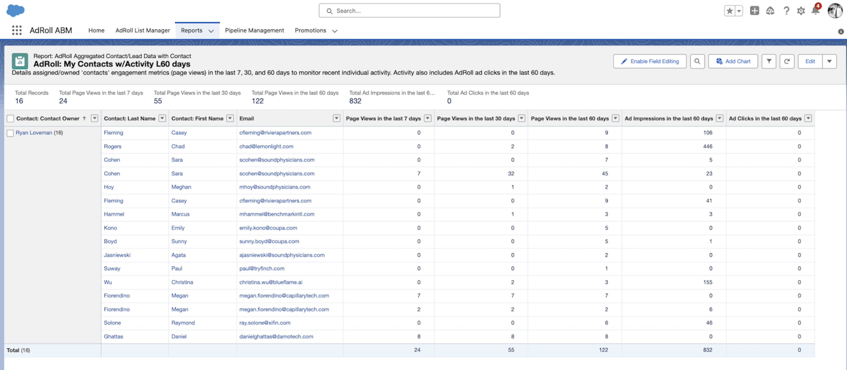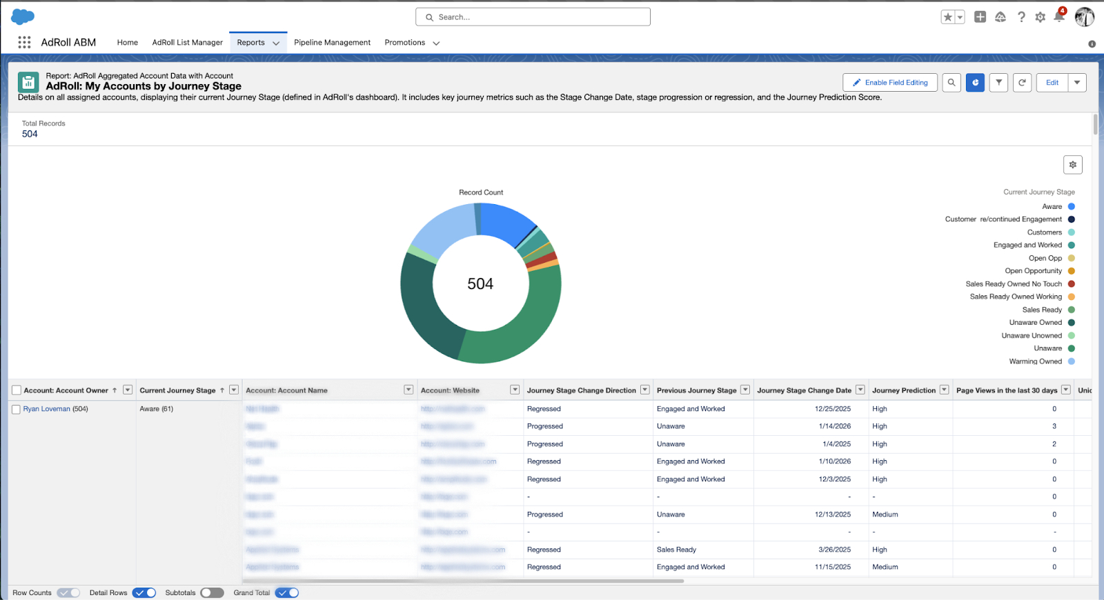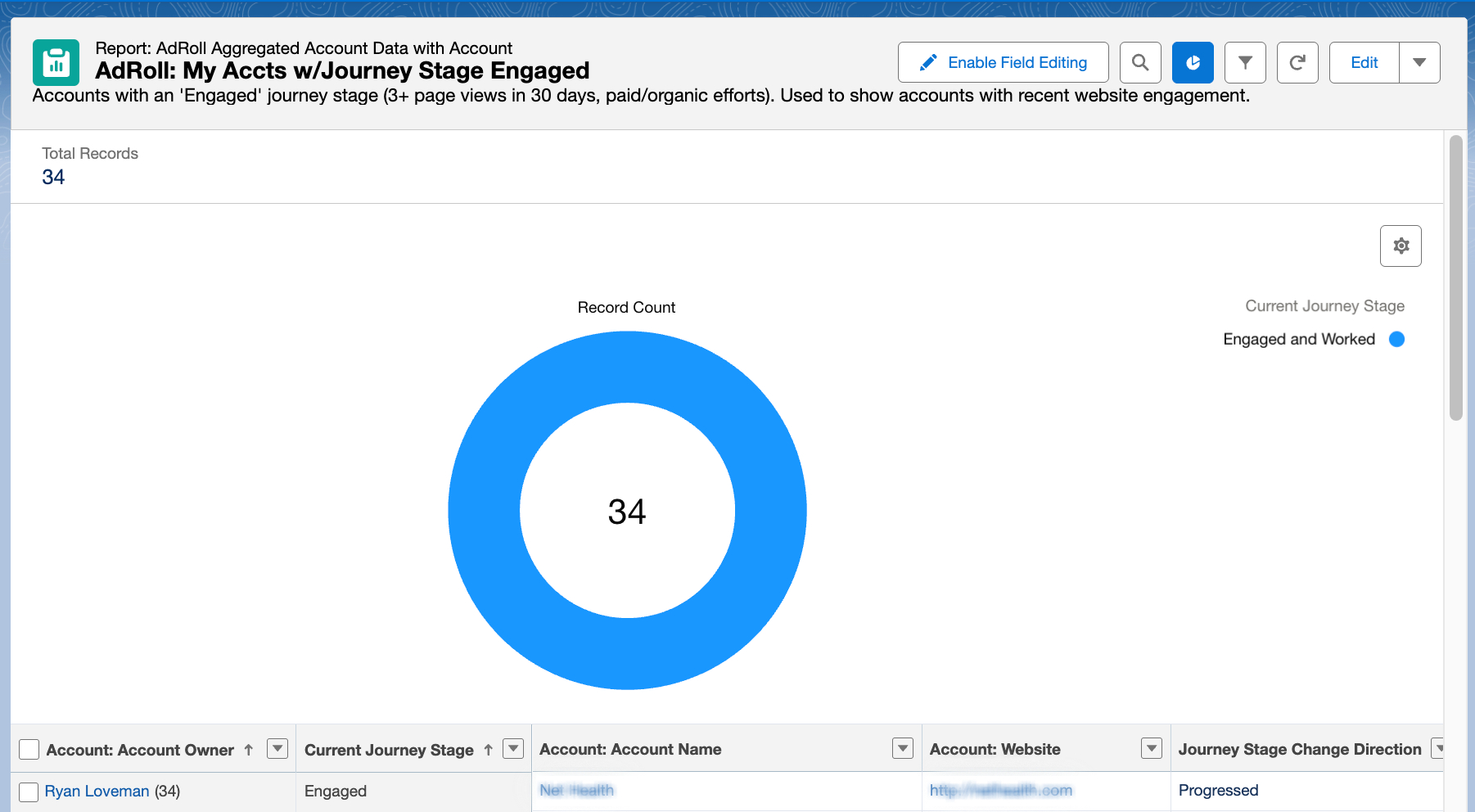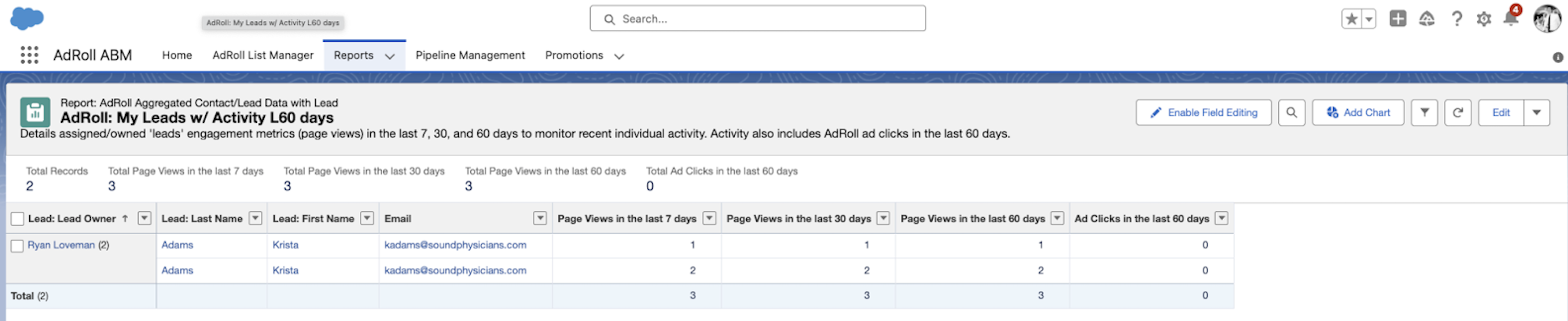 The AdRoll: Account Engagement & Priority Dashboard utilizes the following out-of-the-box reports to present data to your Sales Representatives.