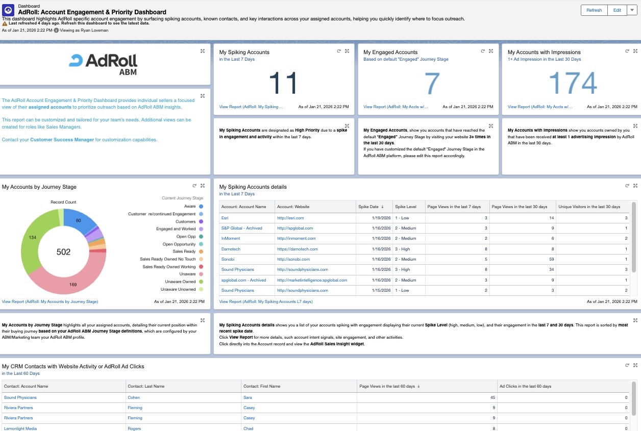 The dashboard serves as a "source of truth" to validate that marketing and AdRoll programs are driving meaningful account-level engagement. This allows Sales to coordinate follow-up efforts while campaigns are still active, creating a unified experience for the prospect.
