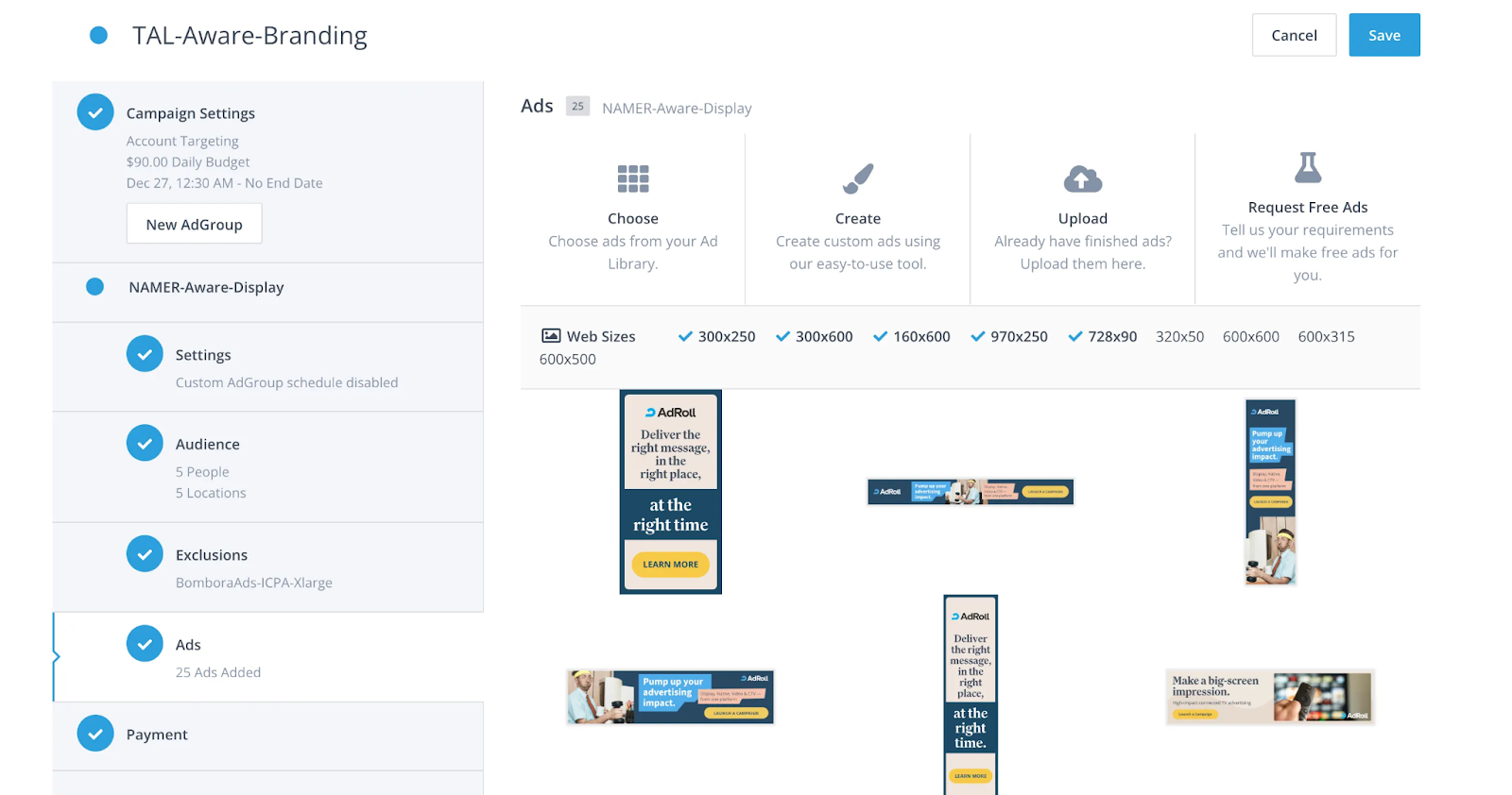 Upload ads into Variant A and Variant B. You can upload multiple ad formats (e.g., sizes), but: