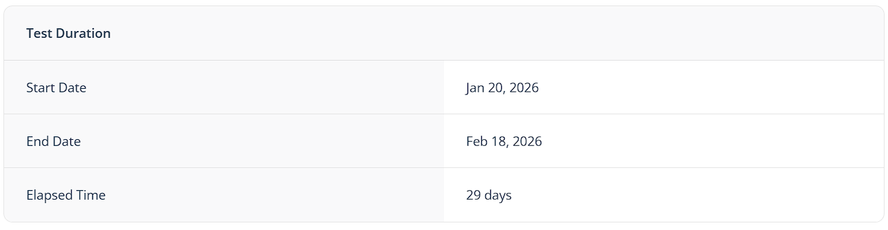 | Test Duration | The Test Duration table shows the first and last day of the A/B tests and the total number of elapsed days. |