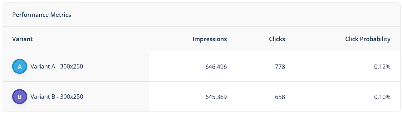 | Performance Metrics | The Performance Metrics table shows, for each variant, the cumulative number of impressions served and clicks received. We also report the click probability as a percent chance. Note that for the statistical analysis we only count unique cookies each day so these numbers may differ somewhat from other campaign reporting. |