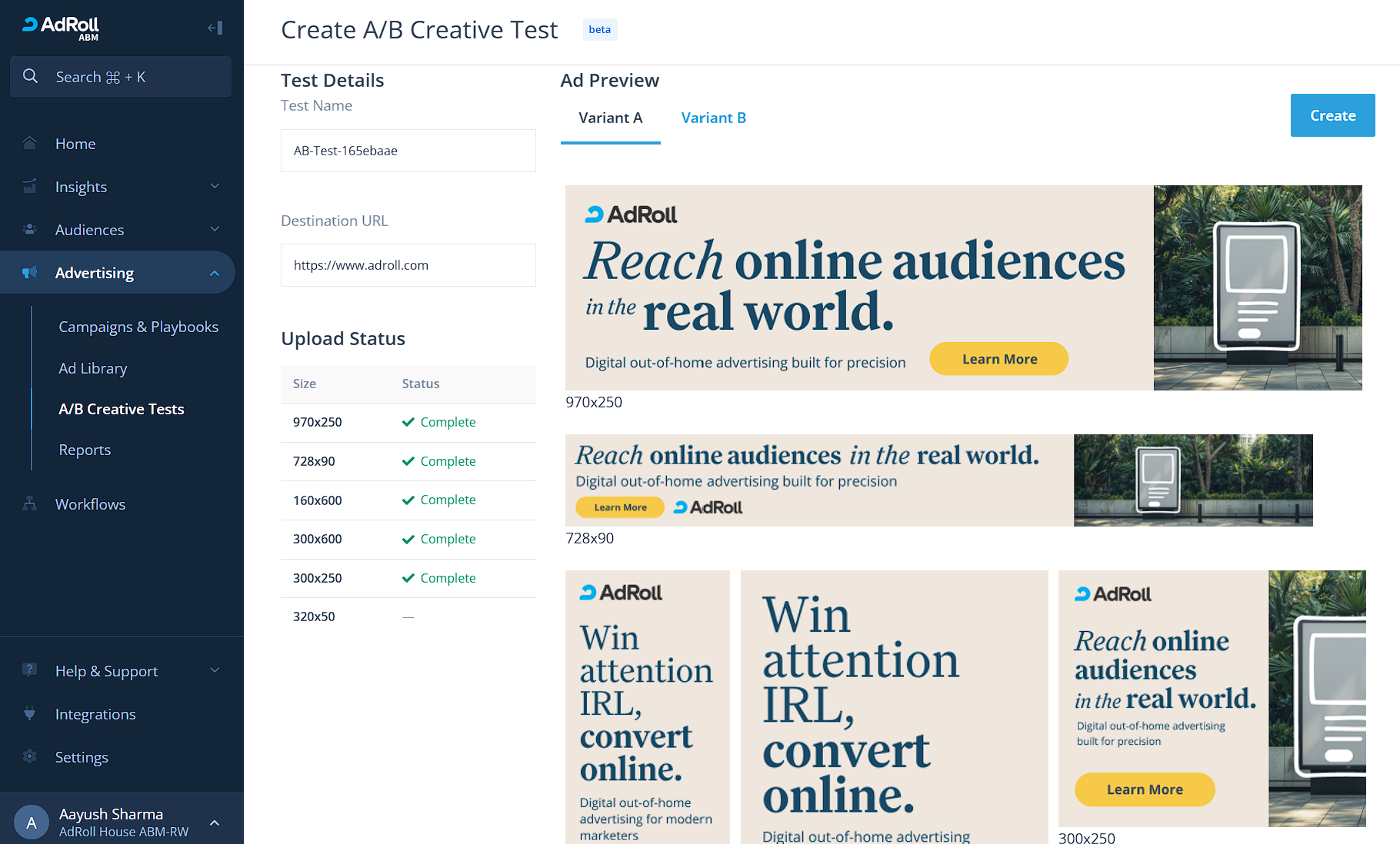 During this test you will create and upload two ad variants (A and B) to the AdRoll platform. AdRoll shows Variant A to one group of unique users and Variant B to another (a 50/50 split). AdRoll measures performance using click-through rate and applies statistical testing to determine whether the observed difference reflects a true lift or normal variation. The tests are spend-balanced automatically. You don’t need to micromanage budgets or run messy “two-campaign” comparisons – AdRoll keeps the experiment fair for you.