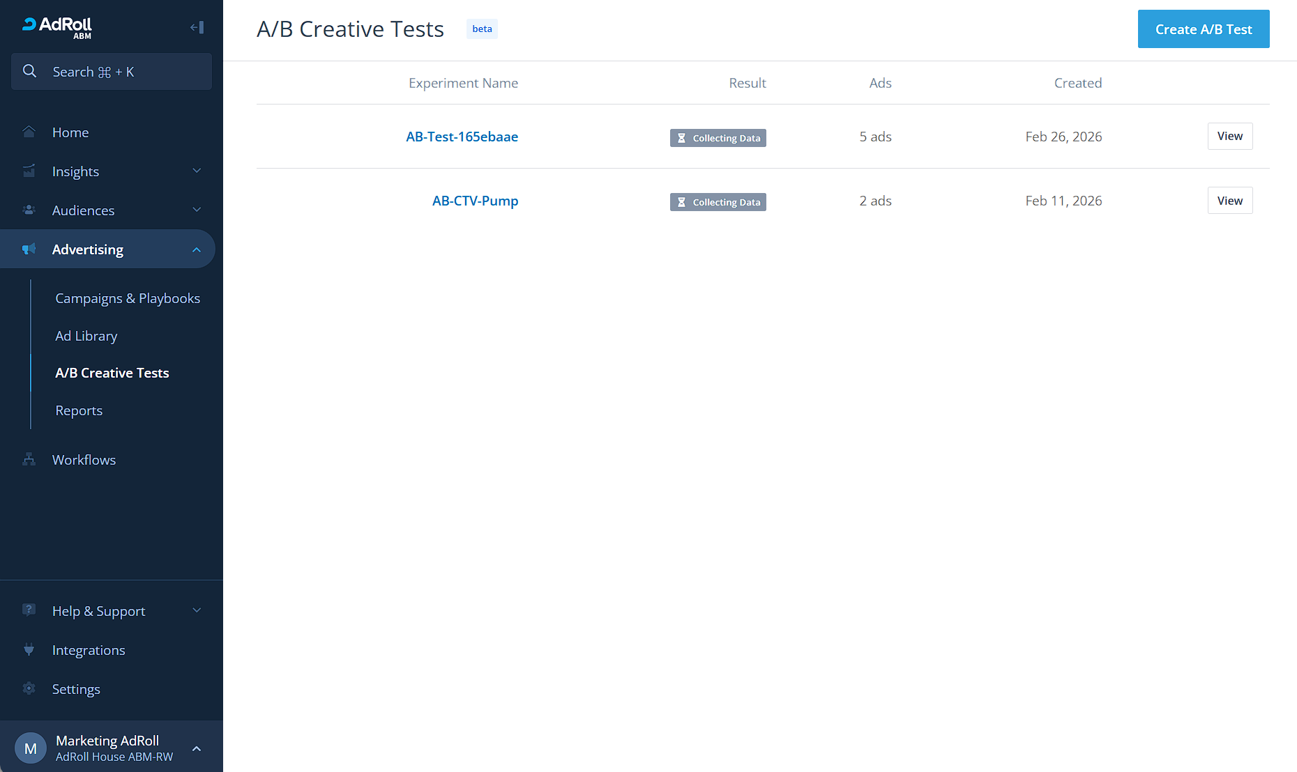 In the left navigation, expand Advertising and select A/B Creative Tests. On the A/B Creative Tests page, click Create A/B Test.