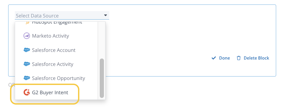 In the dropdown, select the G2 Buyer Intent data object and choose between: