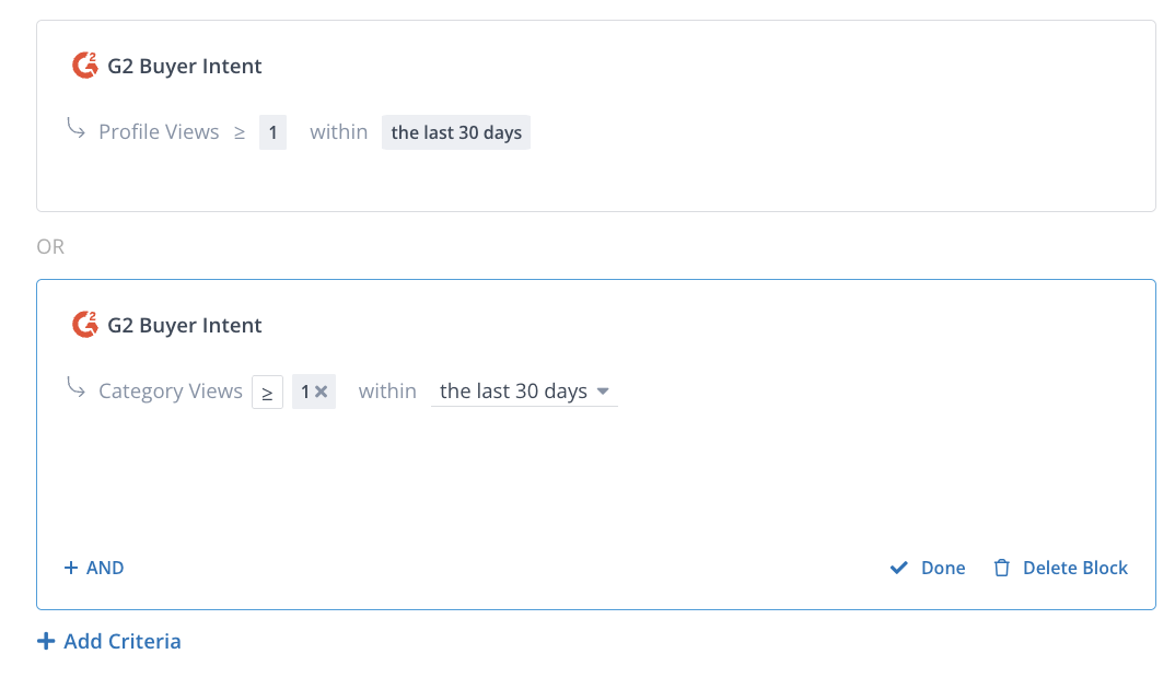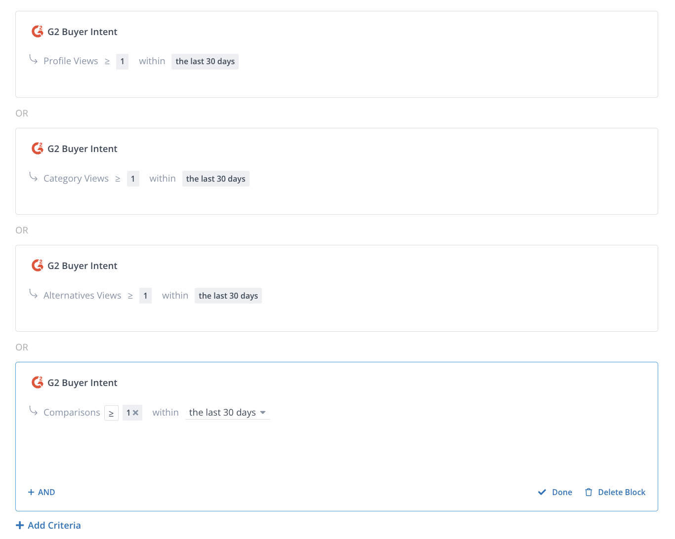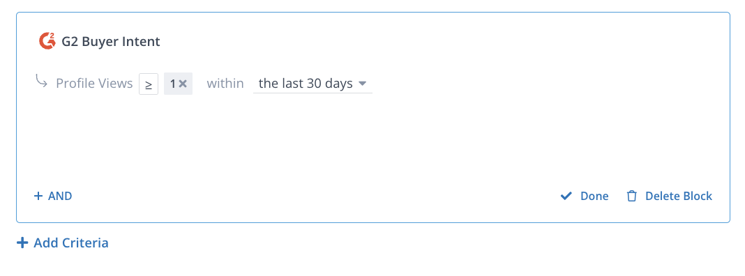 Repeat the same steps to add additional G2 Intent data fields to define the logic that defines your new Account List by adding additional G2 Intent data. In this example, we added 4 different logics to define our Account List using G2 Intent data: