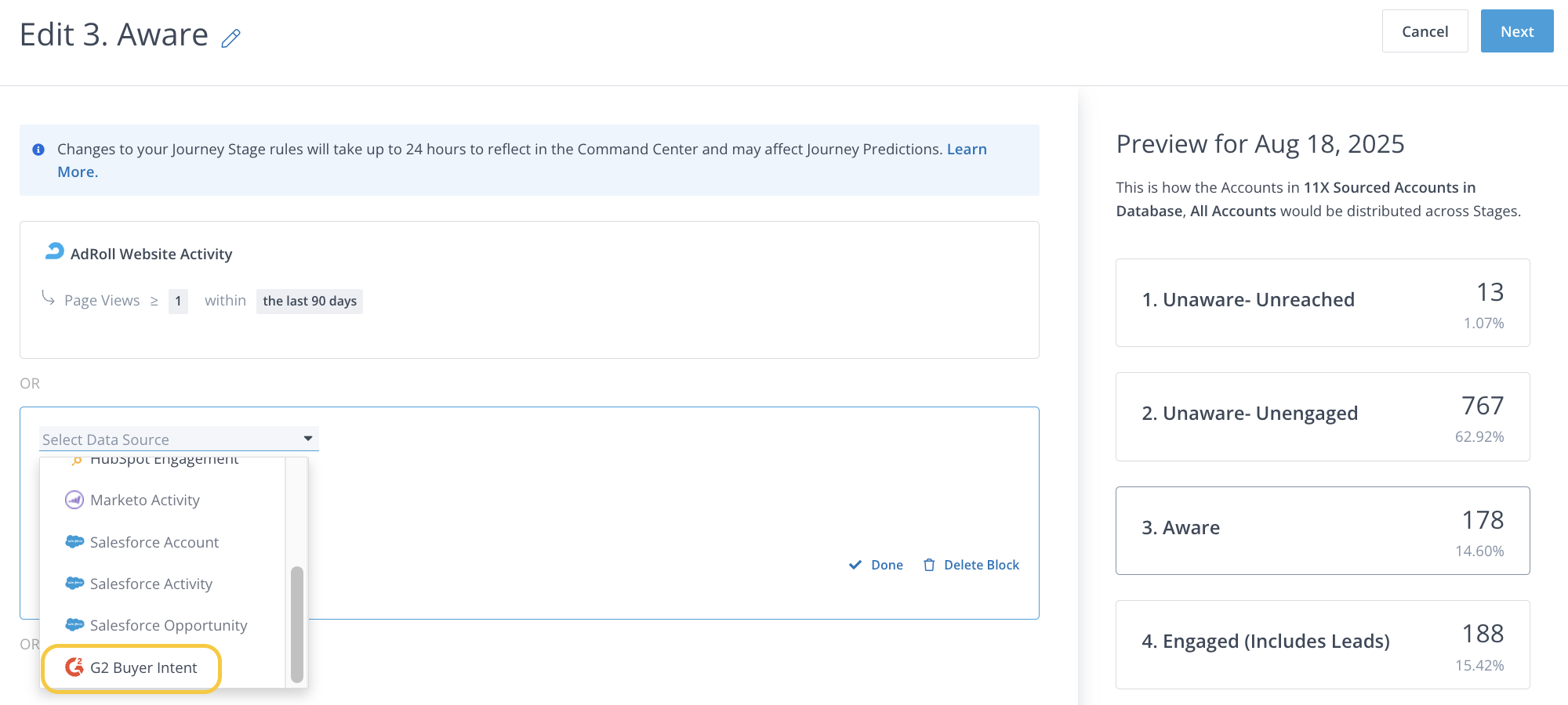 In the example below, we will walk you through how to customize the AdRoll Journey Stage for 'Aware' accounts by using G2 Buyer Intent data based on 'Profile Views' and 'Category Views':