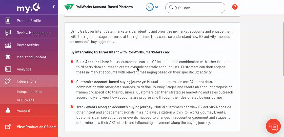 The G2 integration you to use your own G2 buyer intent data to identify and engage in-market prospects and uncover companies exploring your company and your competitors. You will be able to: