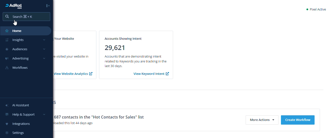 This article will help you find your way around your account. Depending on your subscription package, you may see fewer options in the navigation sidebar. For example, if you have a Standard Advertising package, you will not have access to Workflows.