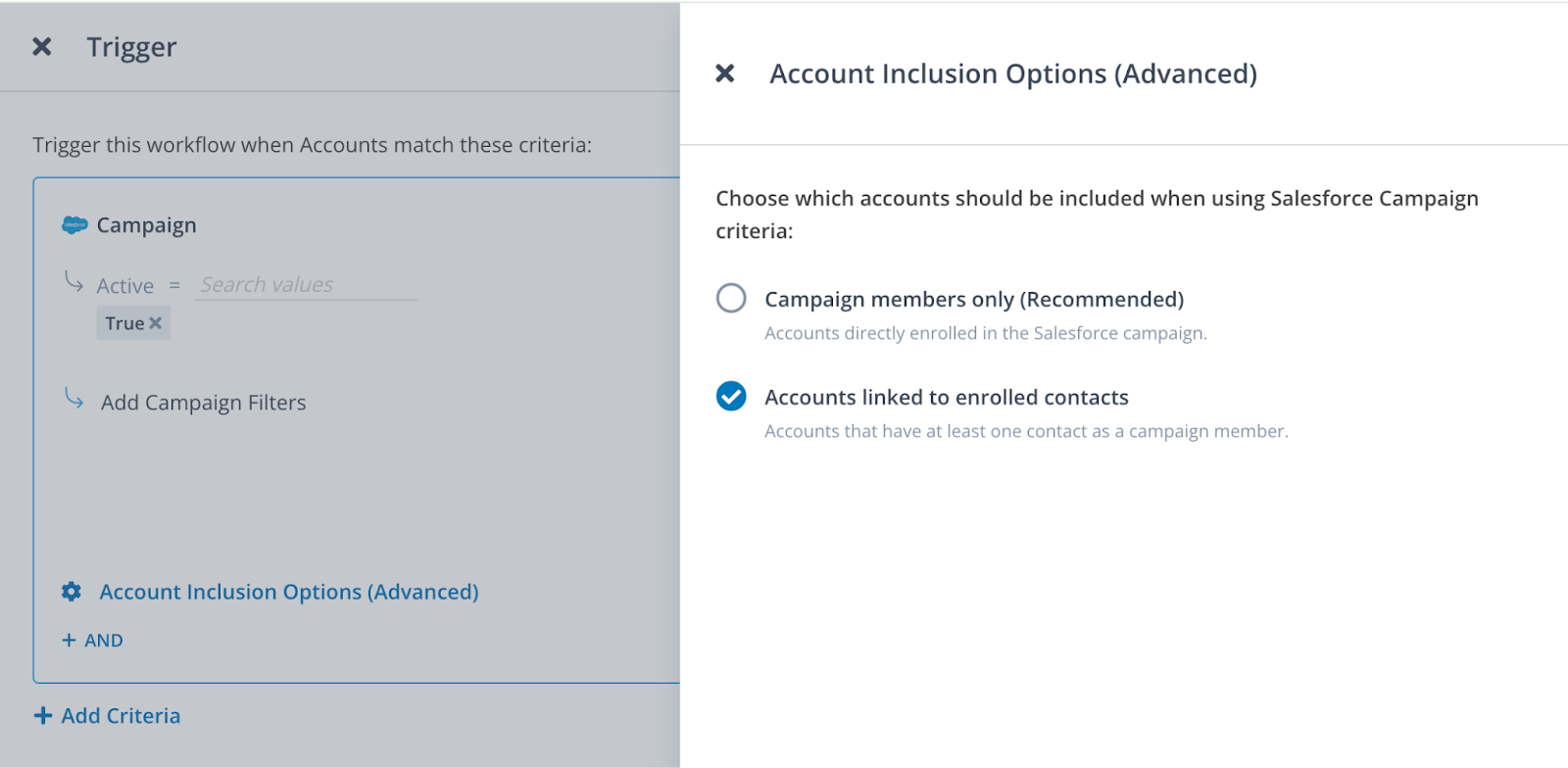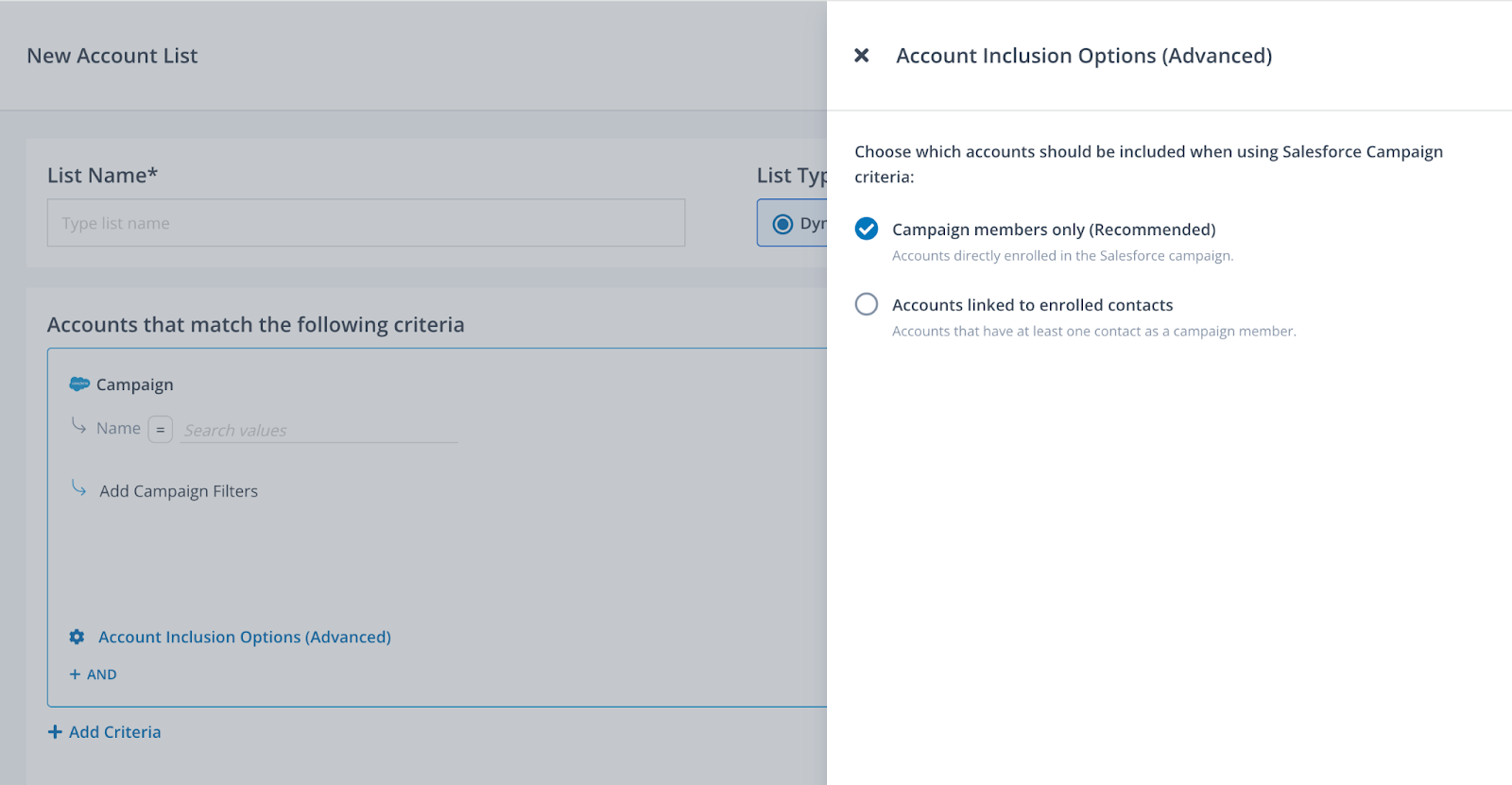 When using a Salesforce Campaign as a filter with the Account List Builder or Contact Discovery workflows, you can refine your criteria by selecting between two distinct advanced Account Inclusion Options to determine how accounts are pulled from a Salesforce Campaign: