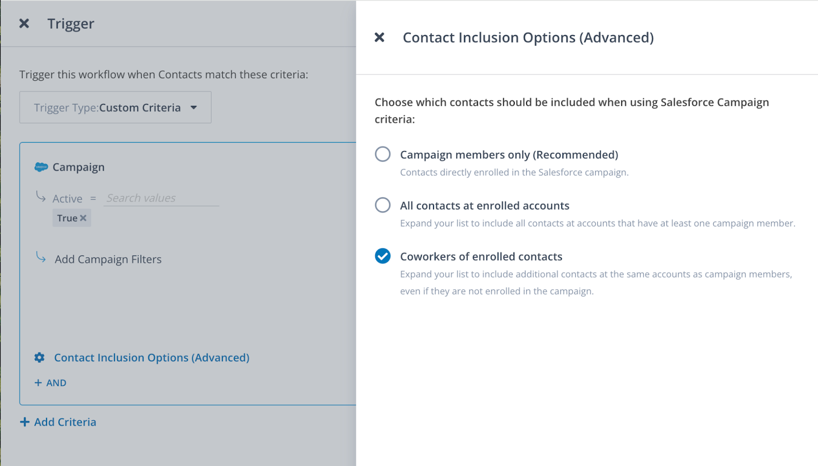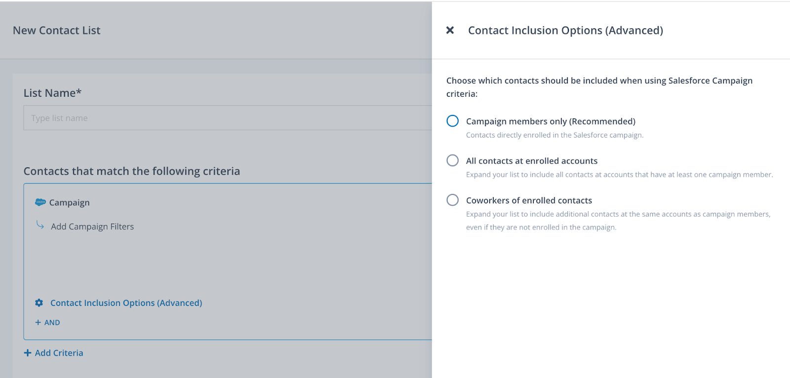 Coworkers of enrolled contacts: Use this option if you're building a contact list using Salesforce campaign(s) that have contact members and you want to reach other contacts at their accounts. This is particularly useful for account-based strategies where you want to reach all contacts at a target account.