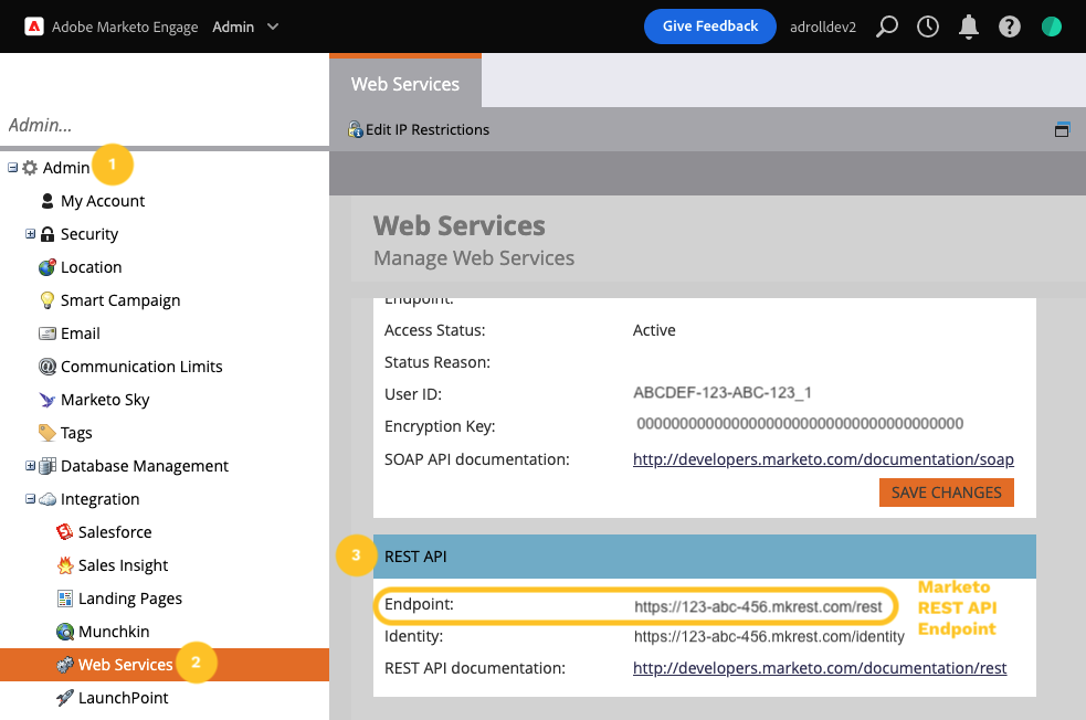 - Log in to Marketo and navigate to Admin > Integration > Web Services.