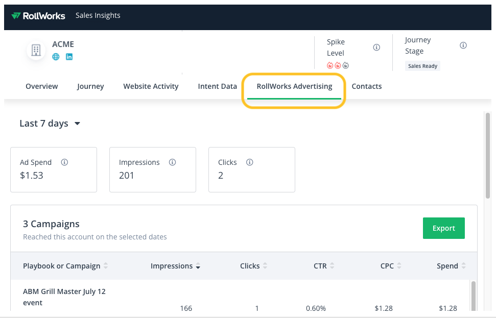 The Sales Insights widget allows sellers to view account and contact insights from the AdRoll ABM platform directly in HubSpot through an easy-to-navigate interface. We recommend sellers do the following: