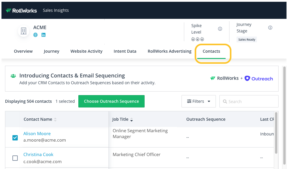 From the Recommended Contacts tab within Sales Insights, sellers can easily add Contacts to an Outreach Sequence to start the outbound process in the Sales Insight widget and save sales time by switching between platforms. Read this guide to learn more about the Outreach integration.