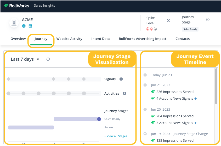 - Journey Event Timeline. View activity data like SDR emails sent and opened, meetings booked, deals opened/progressed, and deals closed from Salesforce, Marketo, and Hubspot alongside AdRoll Web and Ad engagement data in a single timeline to see a complete picture of ABM program events. Click here to view a full list of activities tracked under the Journey Event Timeline and the main benefits for sales reps.