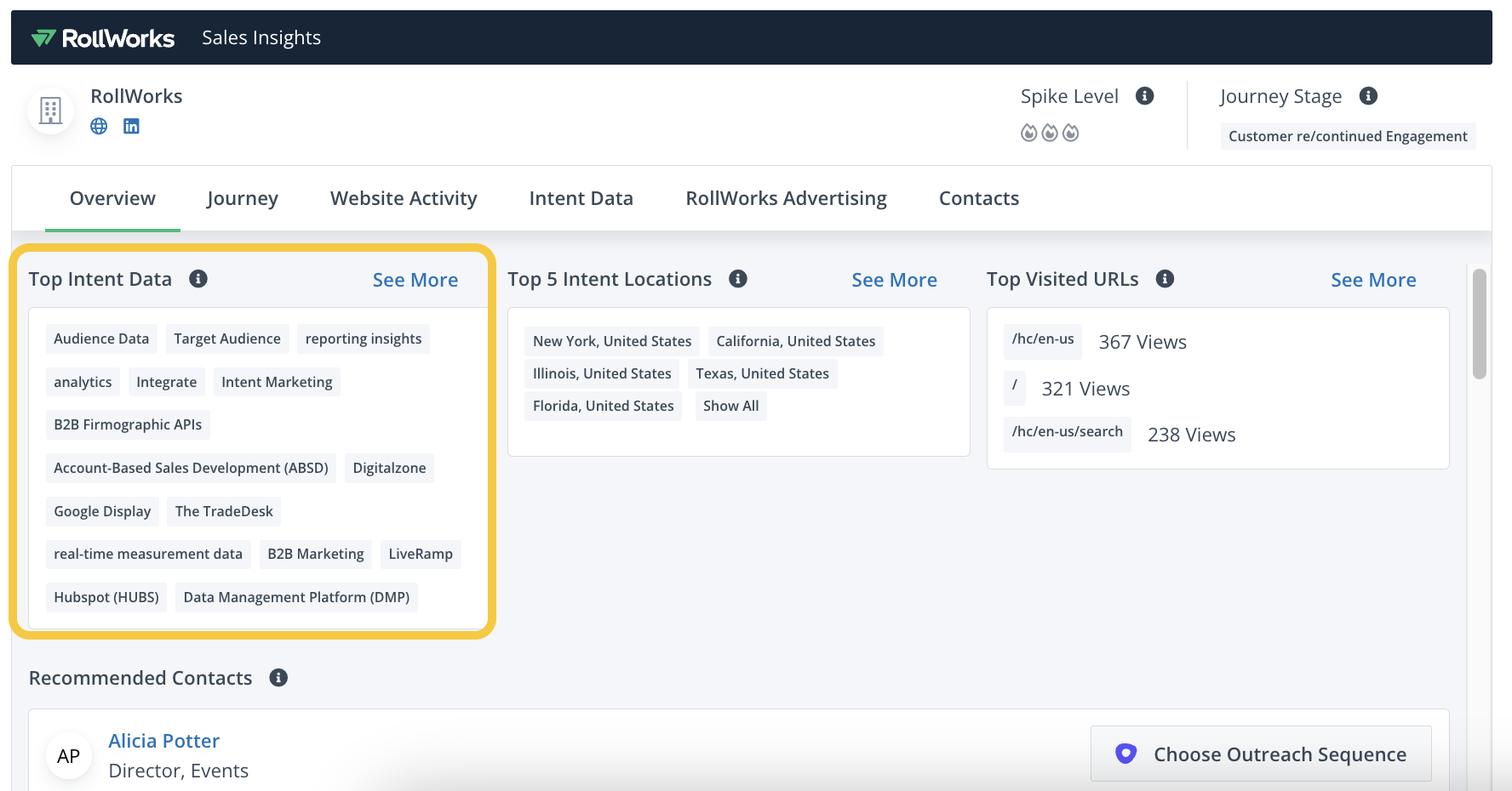 Under the overview tab, sellers will find Account-level intent and engagement signals as well as a list of Recommended Contacts for this account. Expands the sections below to learn how sellers can interpret and act on these insights.