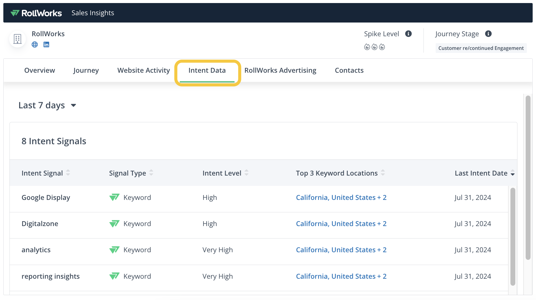 The Intent Data tab allows you to preview if an account is surging with intent for two different intent signals Bombora Company Surge Intent and AdRoll Keyword Intent. Keep in mind that intent signals are only detected for the intent topics and intent keywords that you are actively monitoring.