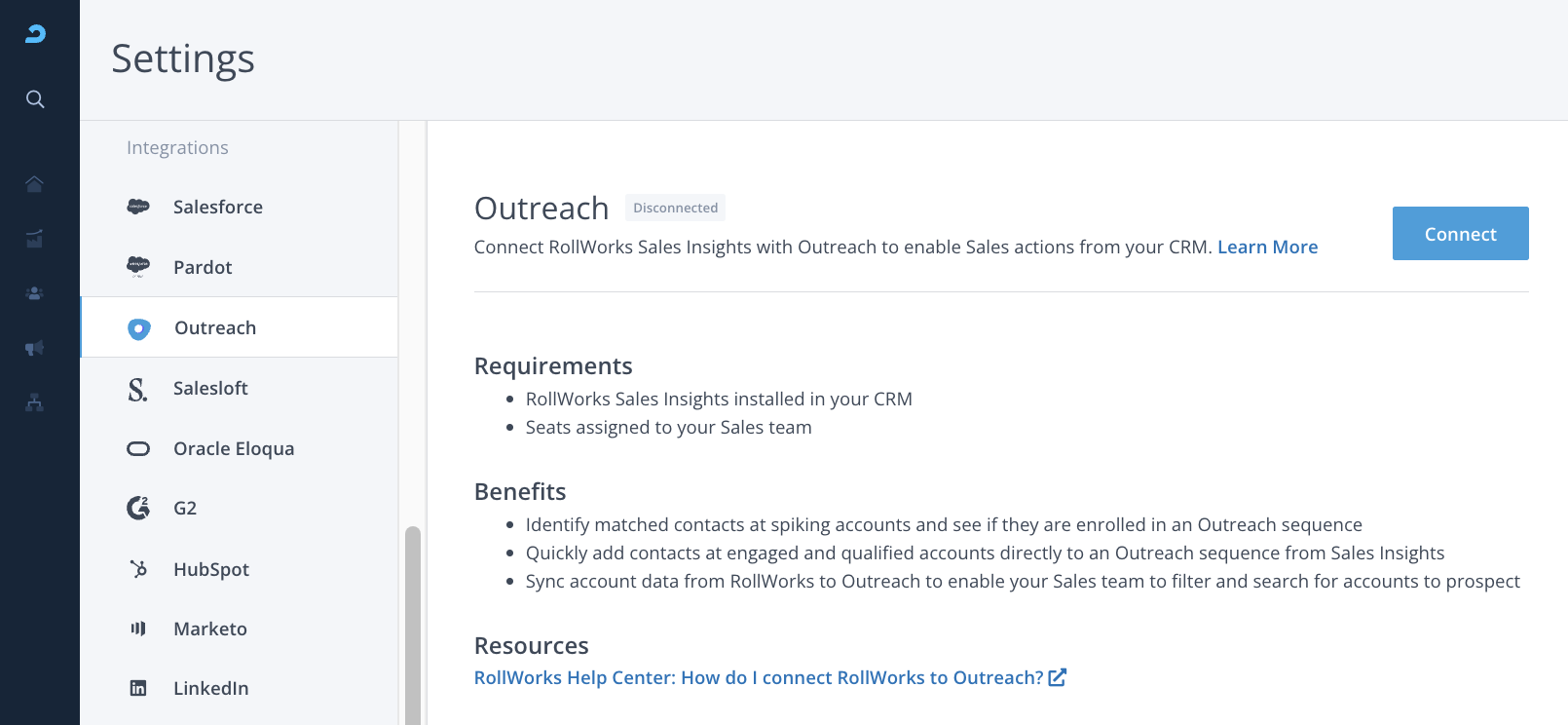 The Outreach Integration is powered by our Sales Insights feature. Before you continue connecting Outreach to the AdRoll ABM platform, you must complete the initial Sales Insights configuration with your CRM and assign at least one seat to your sales team. Choose your CRM and complete this step first: