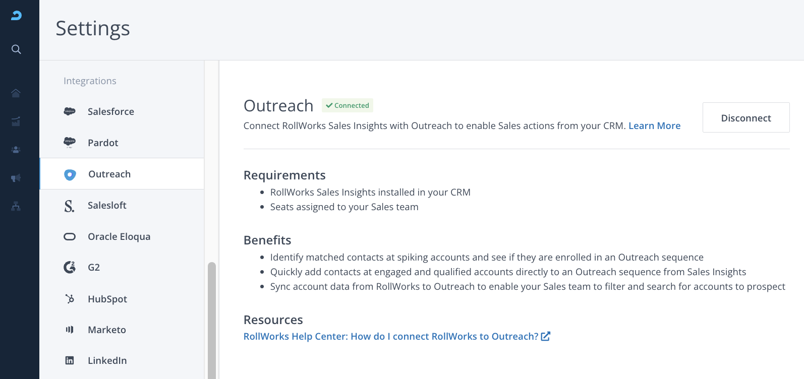 - Log in to AdRoll ABM and navigate to Settings > Integrations > Sales Engagement.